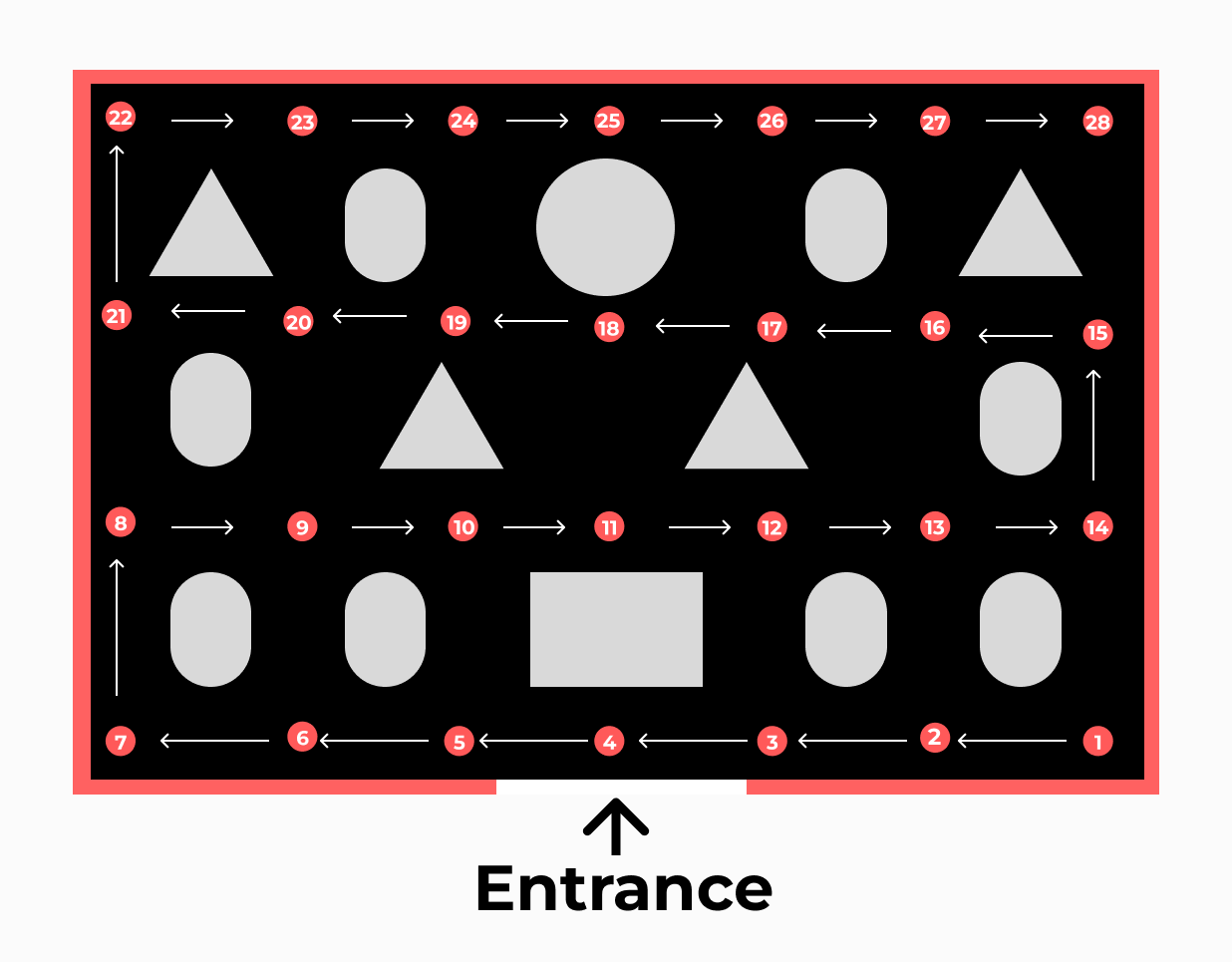 For example, the floor plan below shows 28 scan points neatly aligned throughout the store, with the starting scan point “ 1 ” positioned in the corner near the entrance.