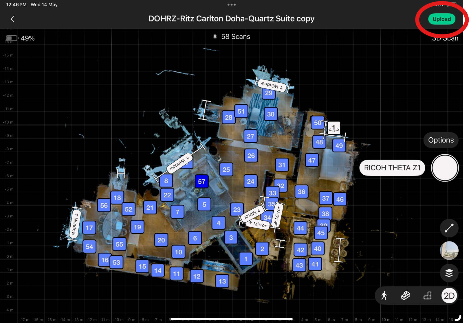 2. Once you have captured all scans, tap “Upload” to send your scans to the Matterport Cloud.